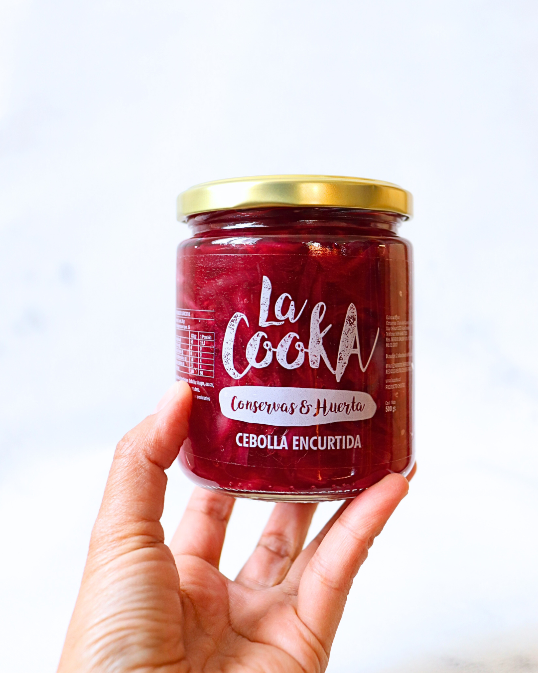 Cebolla crocante, con un toque de betarraga. Escabechada más agri que dulce, deliciosa para todas tus preparaciones.